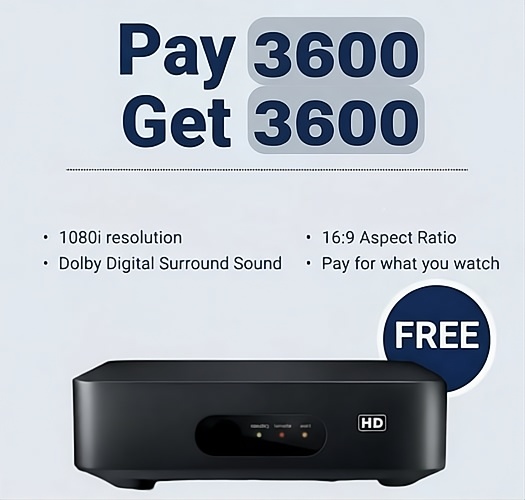 - Accessories- Dish, Setup Box, Universal Remote, 8Mtr. Wire, Adapter and Cable.